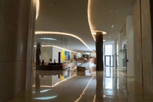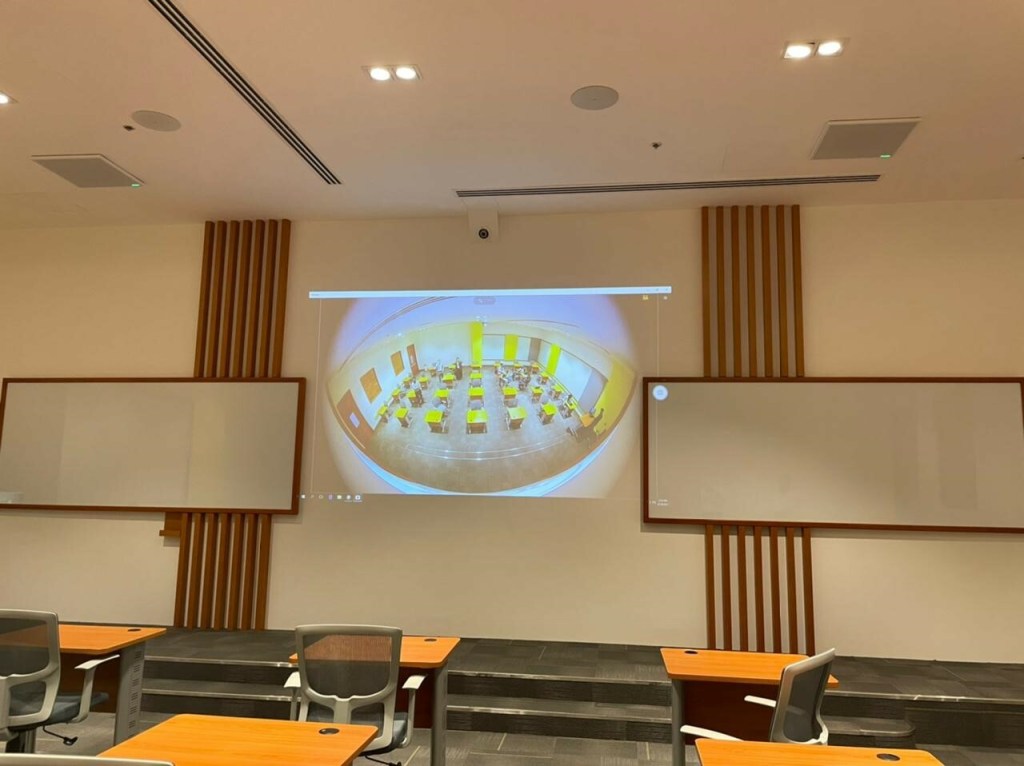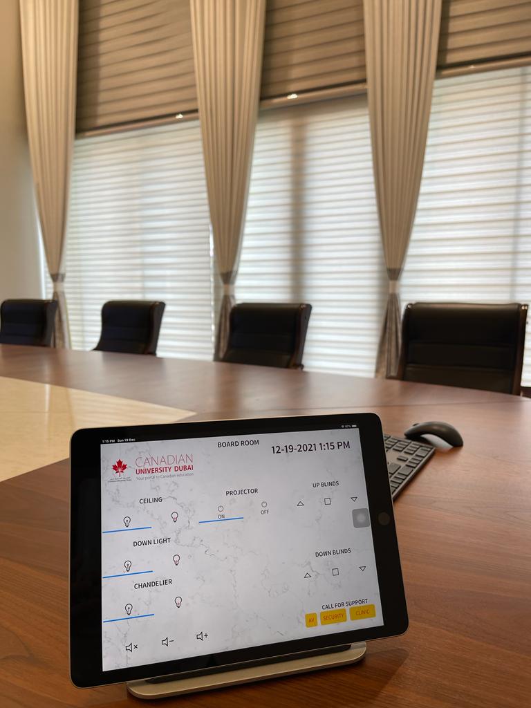 Other invention in the design was, I have worked with the integrator to make teacher’s touch panel more creatives, the touch panels configured with buttons for the students and teacher to easily call for emergencies with simply click a button , not to call, the touch panel configured with security, clinic and AV button which in case of any emergencies or support, students will press the button and for instance the nurse will get notification in her display at the clinic. The classrooms have been added a fisheye camera for the online students to feel like they are in class.