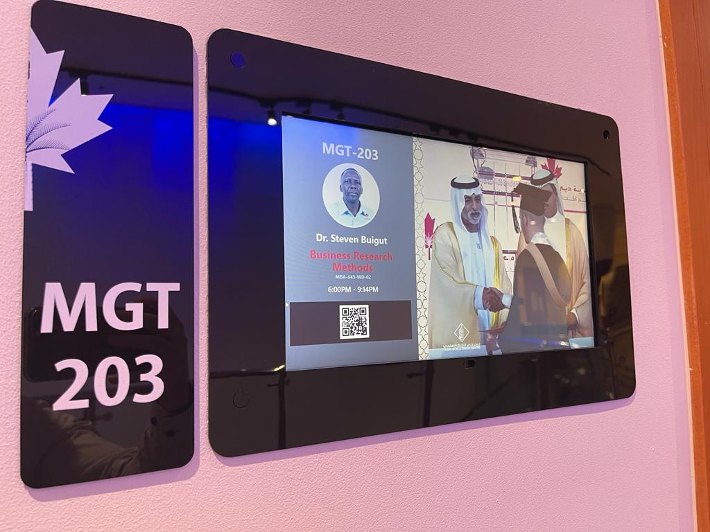 The other amazing installation was to create a creative classrooms scheduler and signage. The scheduler is able to display image and whole information about the class to the students, added QR code for student to scan and know more, not only that the system is able to scan the photo and mark the attendance, and many more functionality all connected to database and automatically updating.